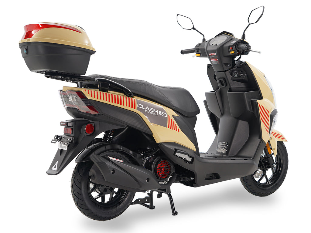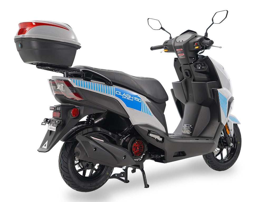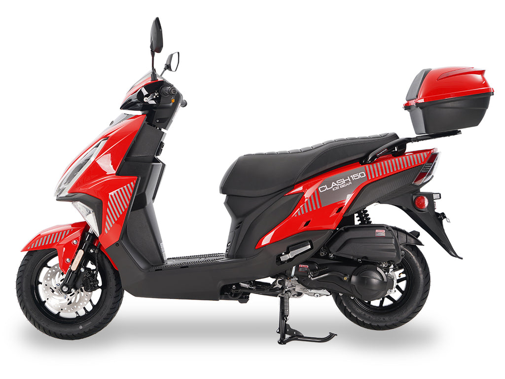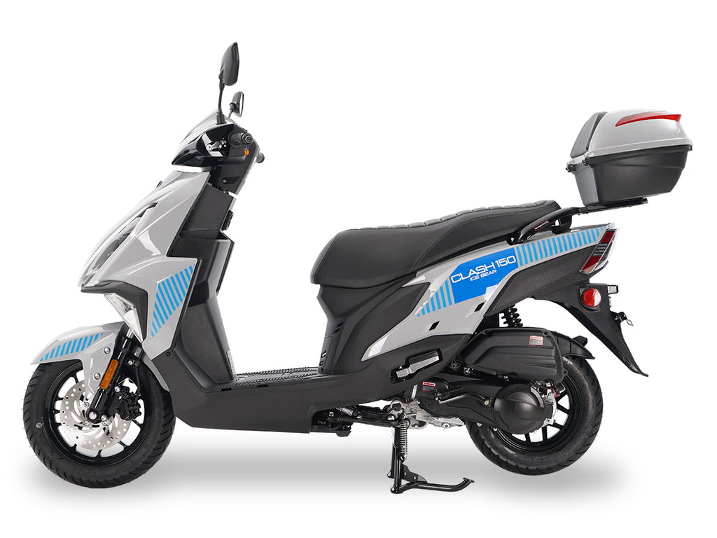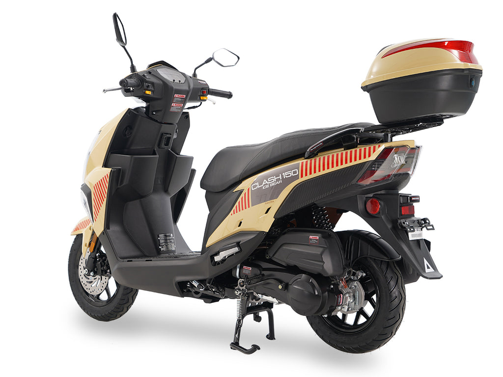 Its automatic transmission and belt drive offer seamless acceleration and easy handling, perfect for navigating city streets. Featuring front disc brakes and rear drum brakes, the Clash 150 delivers precise stopping power for enhanced safety and control. With 90/90-12 tires mounted on 12" aluminum wheels, it ensures stability and grip on various road surfaces. Designed with convenience in mind, the Clash 150 comes with standard lights, including a trunk, mirrors, horn, odometer, and speedometer. Its dual telescopic forks and dual shock suspension system provide a smooth and comfortable ride, even on rough terrains. Unleash your urban adventures with the Ice Bear Clash 150, where style meets performance for an unforgettable riding experience.