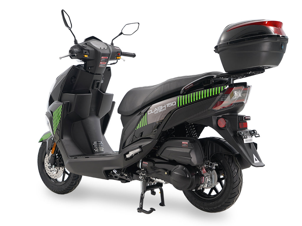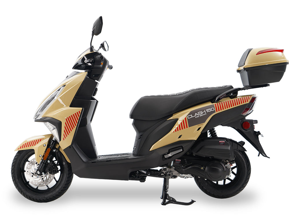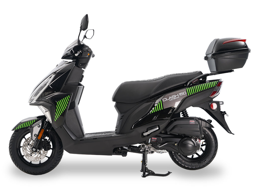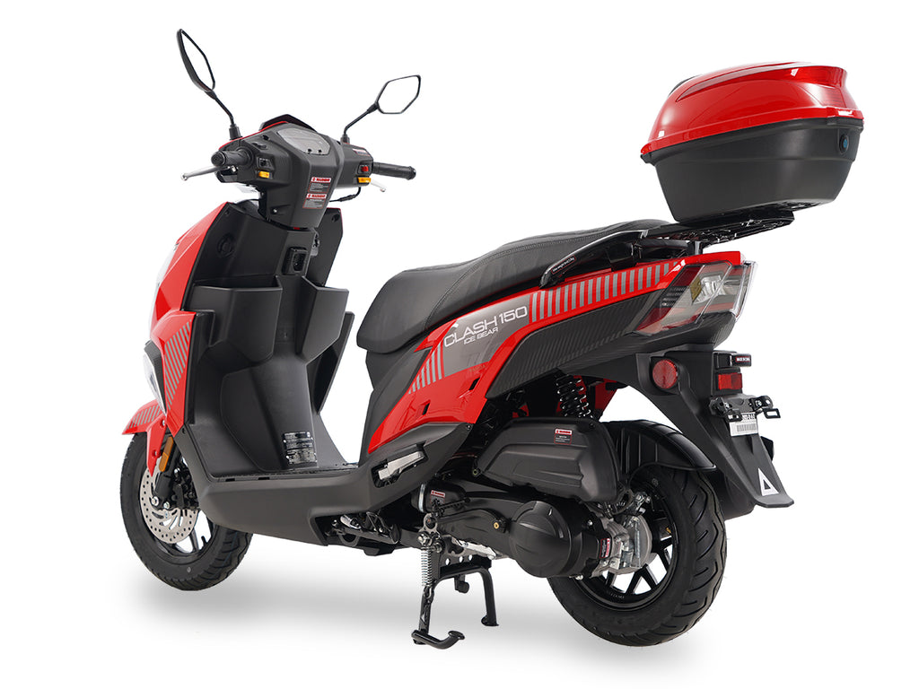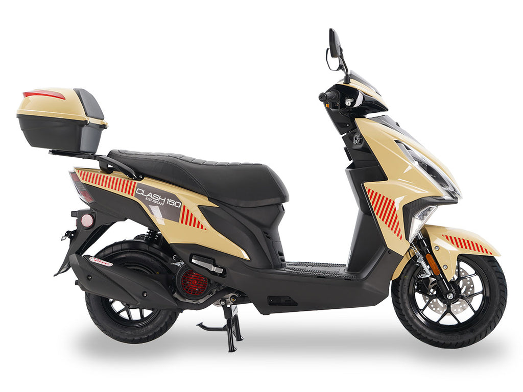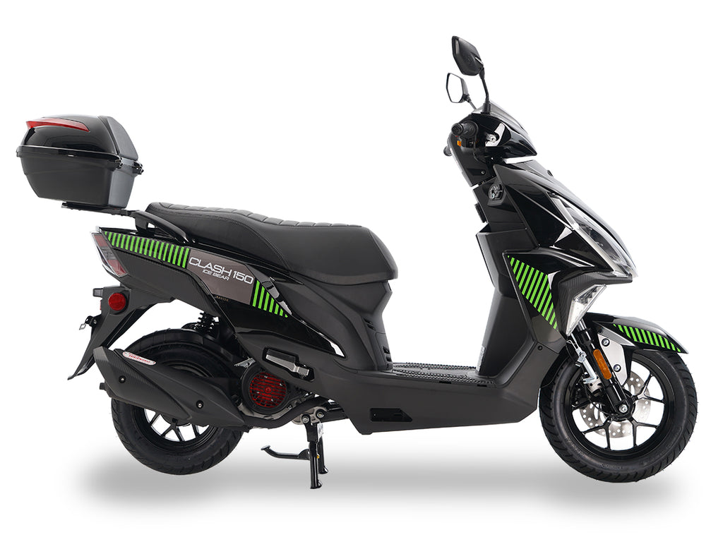 Its automatic transmission and belt drive offer seamless acceleration and easy handling, perfect for navigating city streets. Featuring front disc brakes and rear drum brakes, the Clash 150 delivers precise stopping power for enhanced safety and control. With 90/90-12 tires mounted on 12" aluminum wheels, it ensures stability and grip on various road surfaces. Designed with convenience in mind, the Clash 150 comes with standard lights, including a trunk, mirrors, horn, odometer, and speedometer. Its dual telescopic forks and dual shock suspension system provide a smooth and comfortable ride, even on rough terrains. Unleash your urban adventures with the Ice Bear Clash 150, where style meets performance for an unforgettable riding experience.