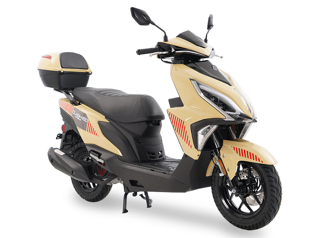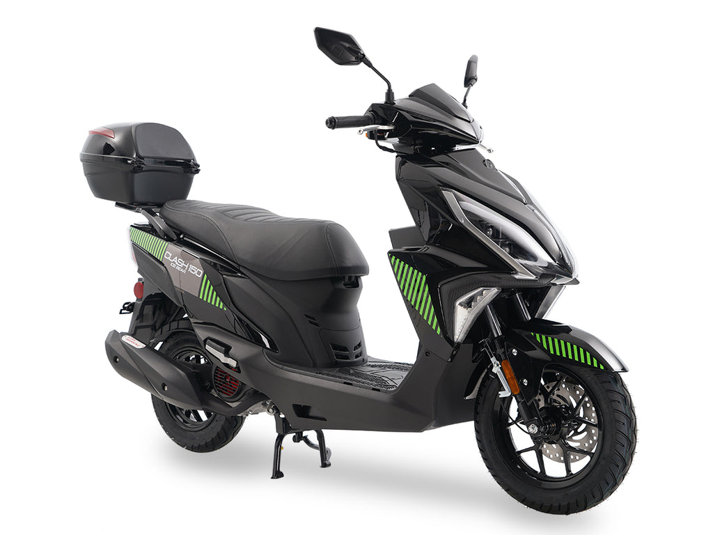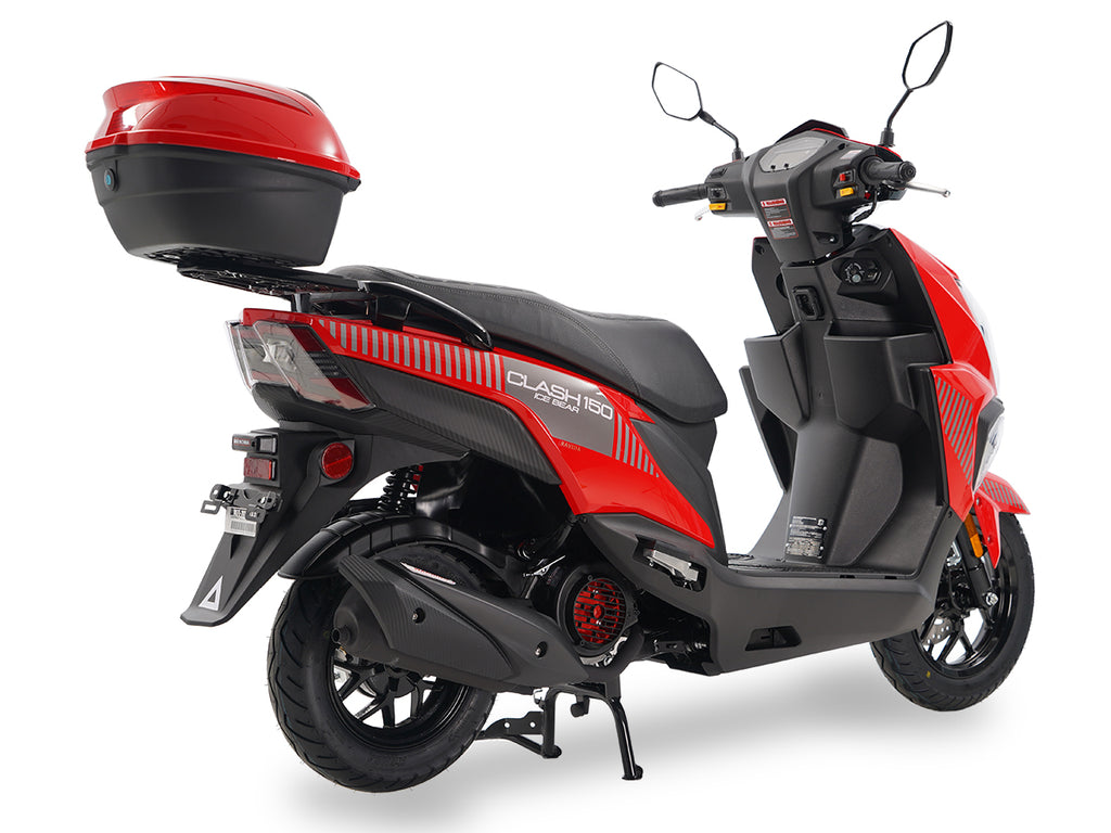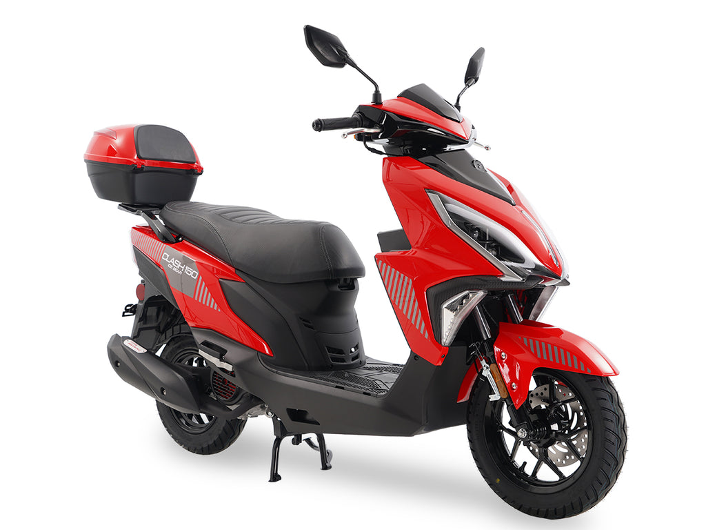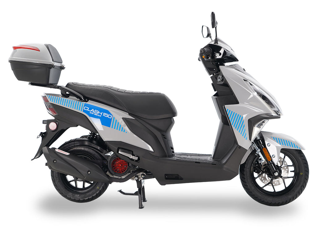 Its automatic transmission and belt drive offer seamless acceleration and easy handling, perfect for navigating city streets. Featuring front disc brakes and rear drum brakes, the Clash 150 delivers precise stopping power for enhanced safety and control. With 90/90-12 tires mounted on 12" aluminum wheels, it ensures stability and grip on various road surfaces. Designed with convenience in mind, the Clash 150 comes with standard lights, including a trunk, mirrors, horn, odometer, and speedometer. Its dual telescopic forks and dual shock suspension system provide a smooth and comfortable ride, even on rough terrains. Unleash your urban adventures with the Ice Bear Clash 150, where style meets performance for an unforgettable riding experience.