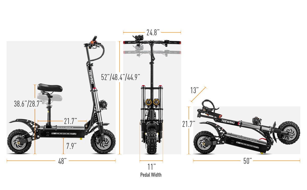 The Teewing X4 is a high-performance. high-tech electric scooter designed for innovation. speed. and reliability. With two independent 2800W motors controlling the front and rear wheels. the combined 5600W dual motor electric scooter power ensures exceptional performance. Weighing less than 45 KG (100 lbs). the X4 is foldable and compact. making it an excellent gift for family members or a practical alternative to rising fuel costs. It’s waterproof (IP54). durable. and ideal for commuting or thrilling rides.